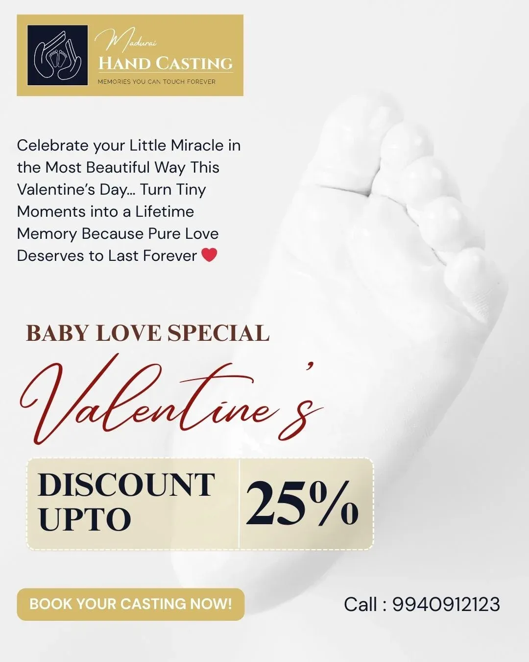 Preserve your baby’s beautiful growing milestones with our premium 3D baby hand and foot casting service in Madurai. We capture the exact size, shape, and fine details of your baby’s tiny hands and feet using 100% safe, non-toxic, and skin-friendly materials. Each cast is professionally handcrafted with elegant finishing, creating a timeless keepsake perfect for milestone celebrations and memory preservation. Book your baby hand and foot casting session in Madurai today.